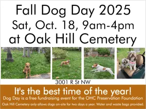 The cemetery opens its gates only twice a year and this will be the last day pups can come stretch their legs and romp through the cemetery. Free though any donations will go to the OHC preservation fund.
